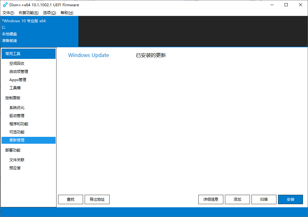 2、解压后并按需打开“Dism++x64.exe”,或“Dism++x86.exe”,点击更新管理: