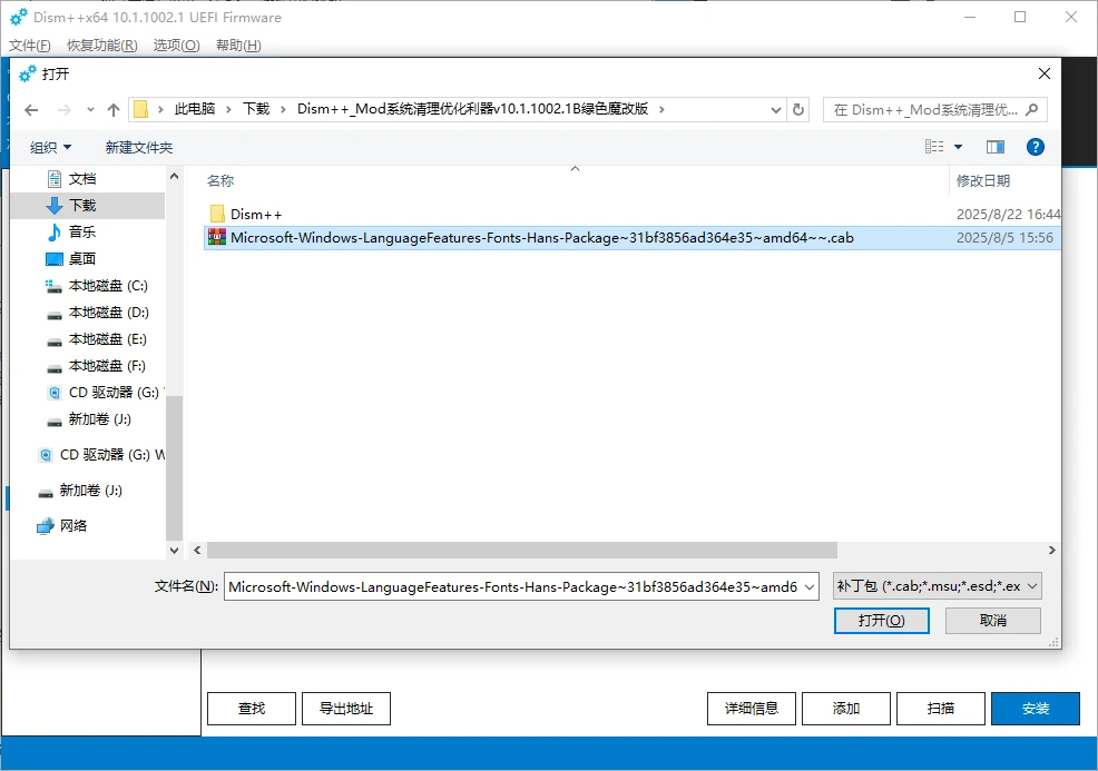 3、在弹出的对话框中选择“Microsoft-Windows-LanguageFeatures-Fonts-Hans-Package~31bf3856ad364e35~amd64~~.cab”并打开:
