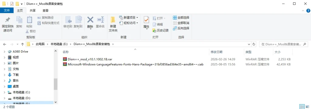 1、首先下载我们提供的文件包,里面有“Dism++_mod_v10.1.1002.1B.rar”、“Microsoft-Windows-LanguageFeatures-Fonts-Hans-Package~31bf3856ad364e35~amd64~~.cab”两个压缩包: